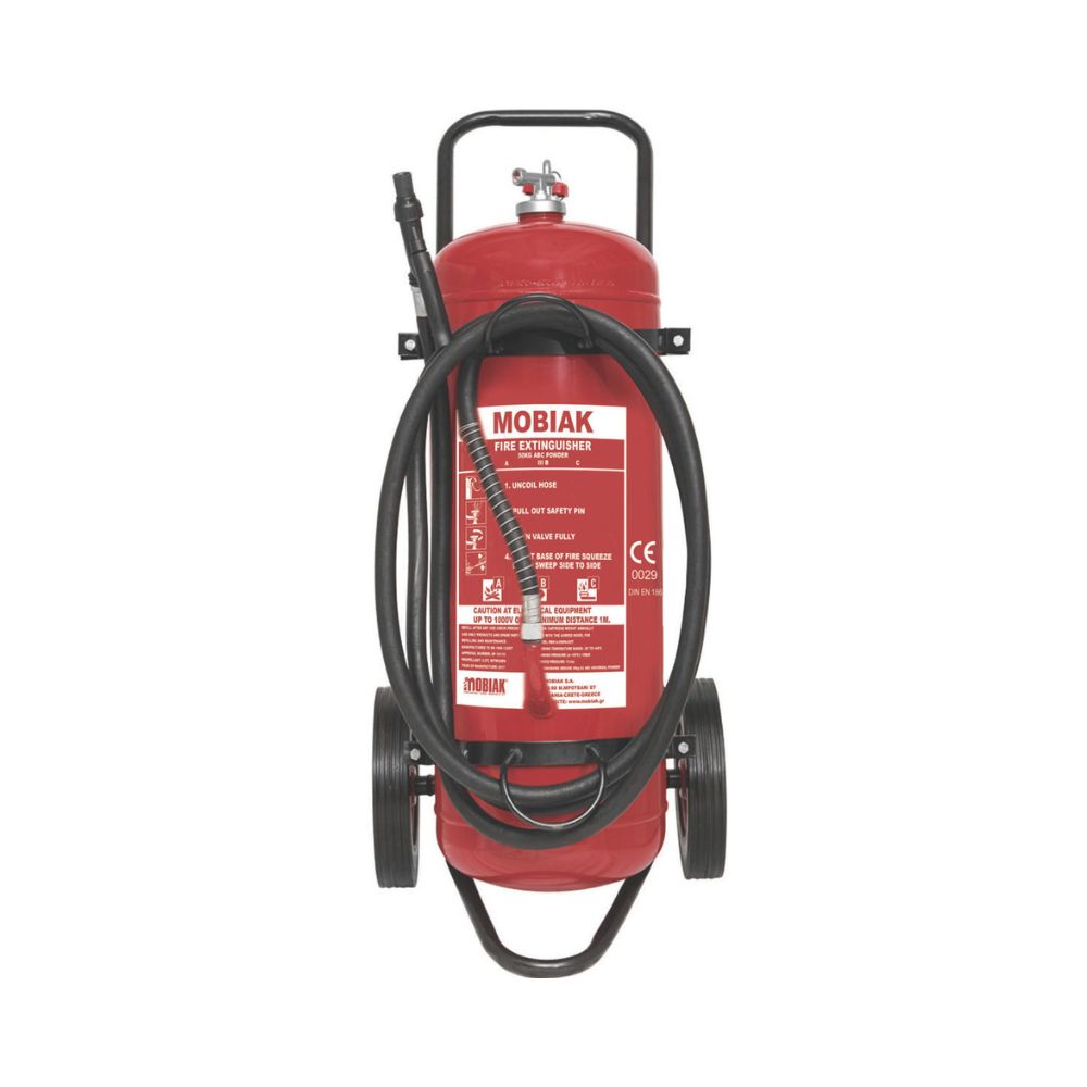 Τροχήλατος πυροσβεστήρας ξηράς σκόνης ABC 40% 50Kg, σκόνης με εξωτερικό φιαλίδιο και λάστιχο εκτόξευσης υλικού 5 μέτρων. Το εξωτερικό φιαλίδιο περιέχει άζωτο ως προωθητικό αέριο.